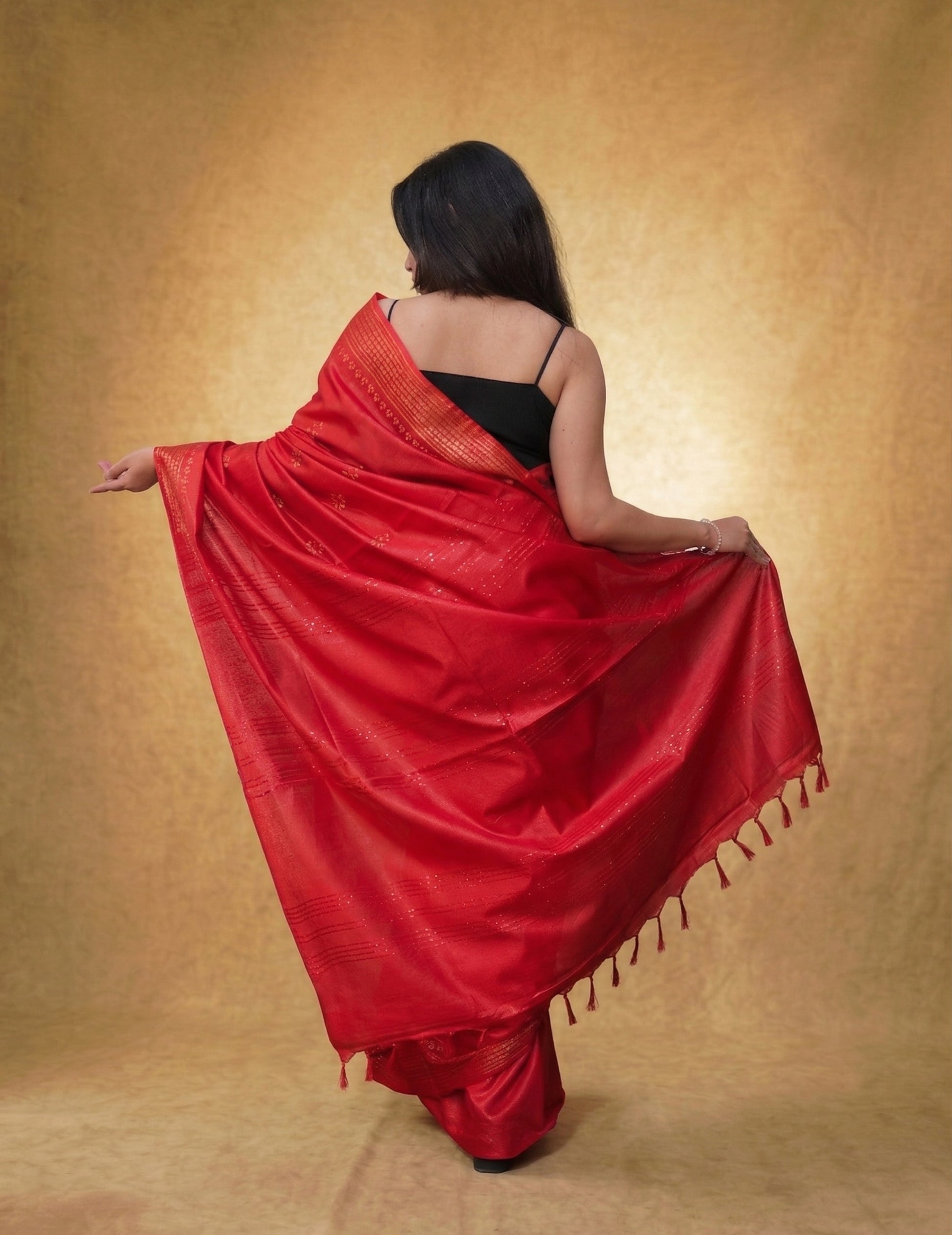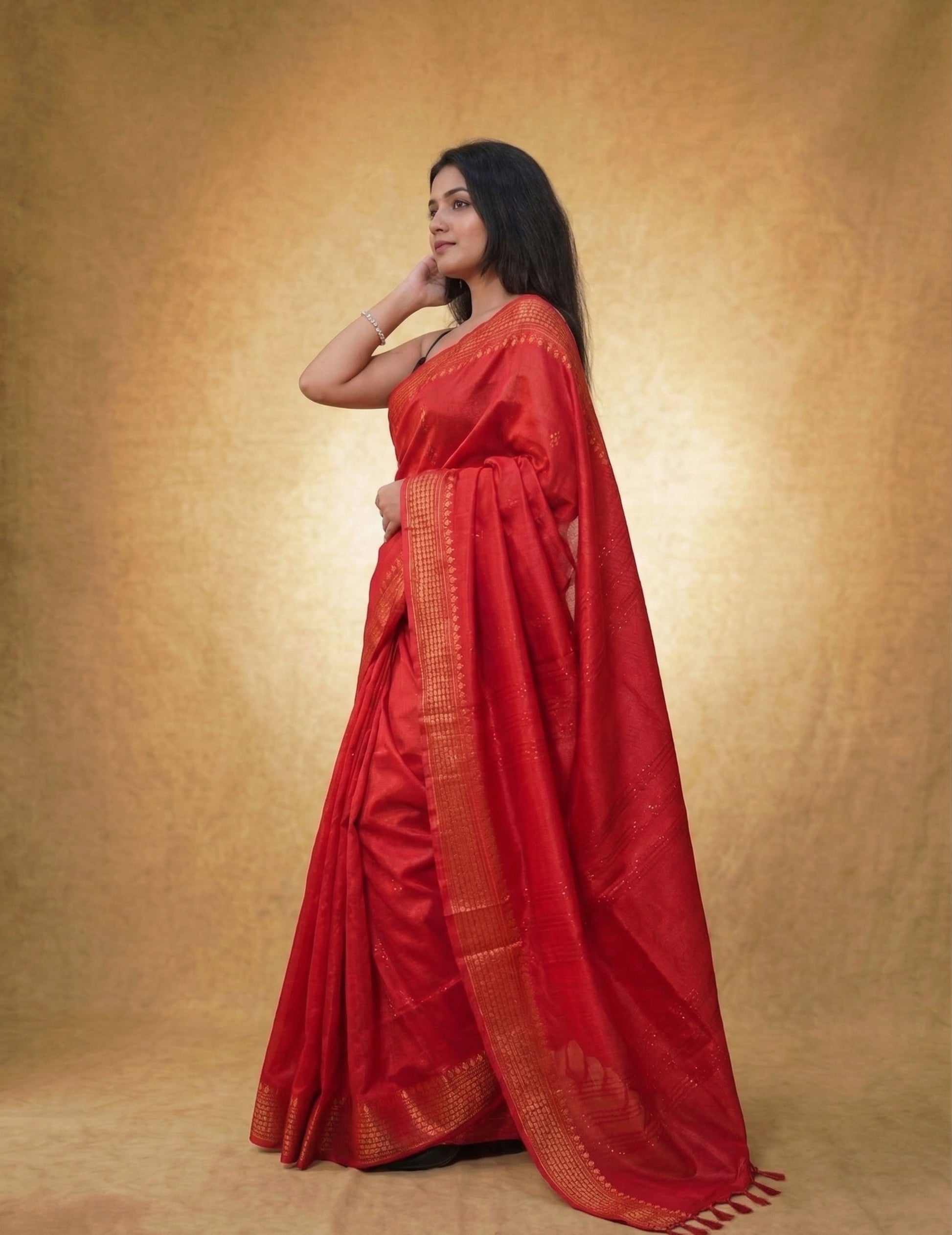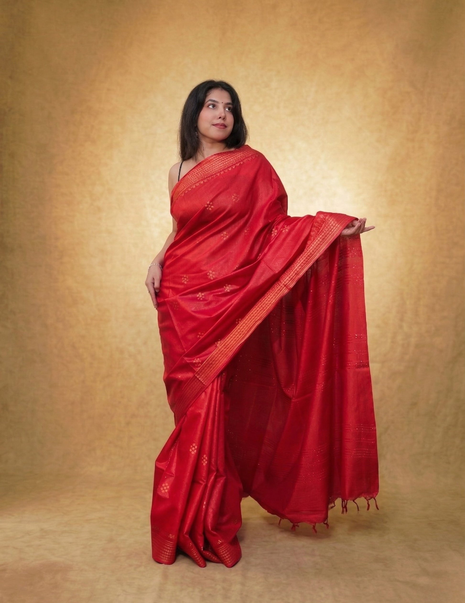 This exquisite saree features a vibrant crimson body adorned with delicate gold buttas, creating a sophisticated look that transitions seamlessly from festive celebrations to formal evenings.