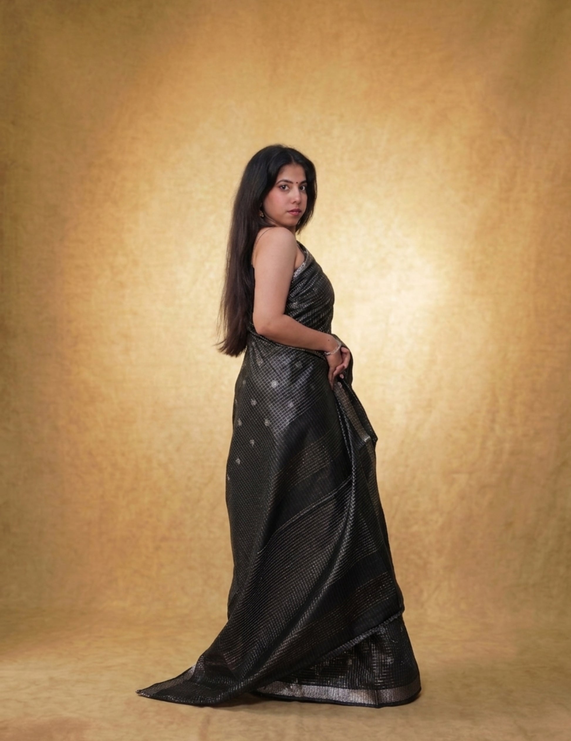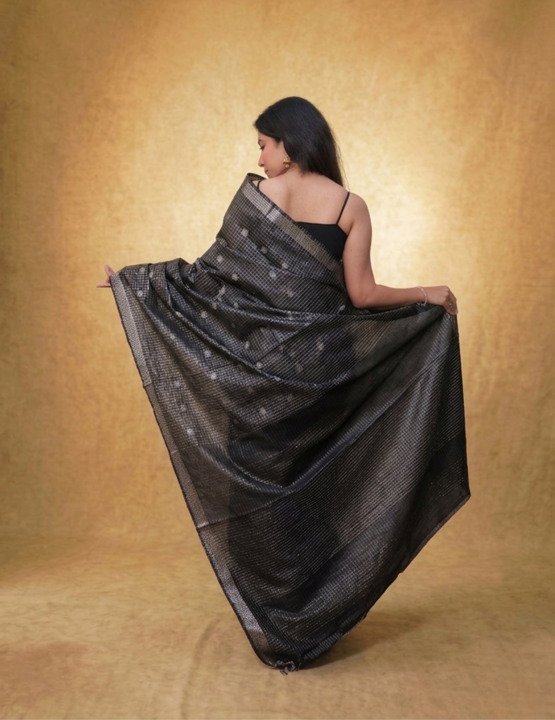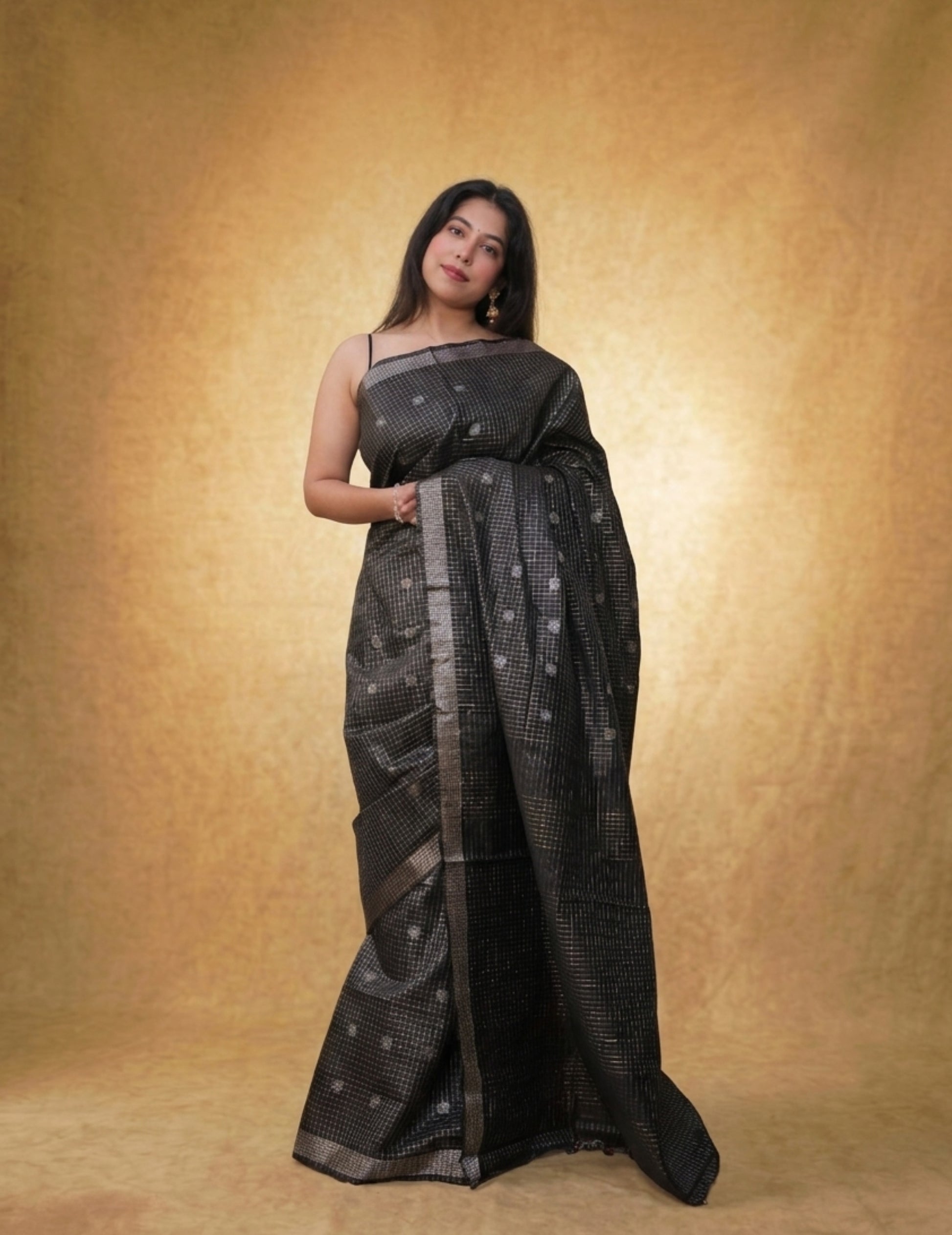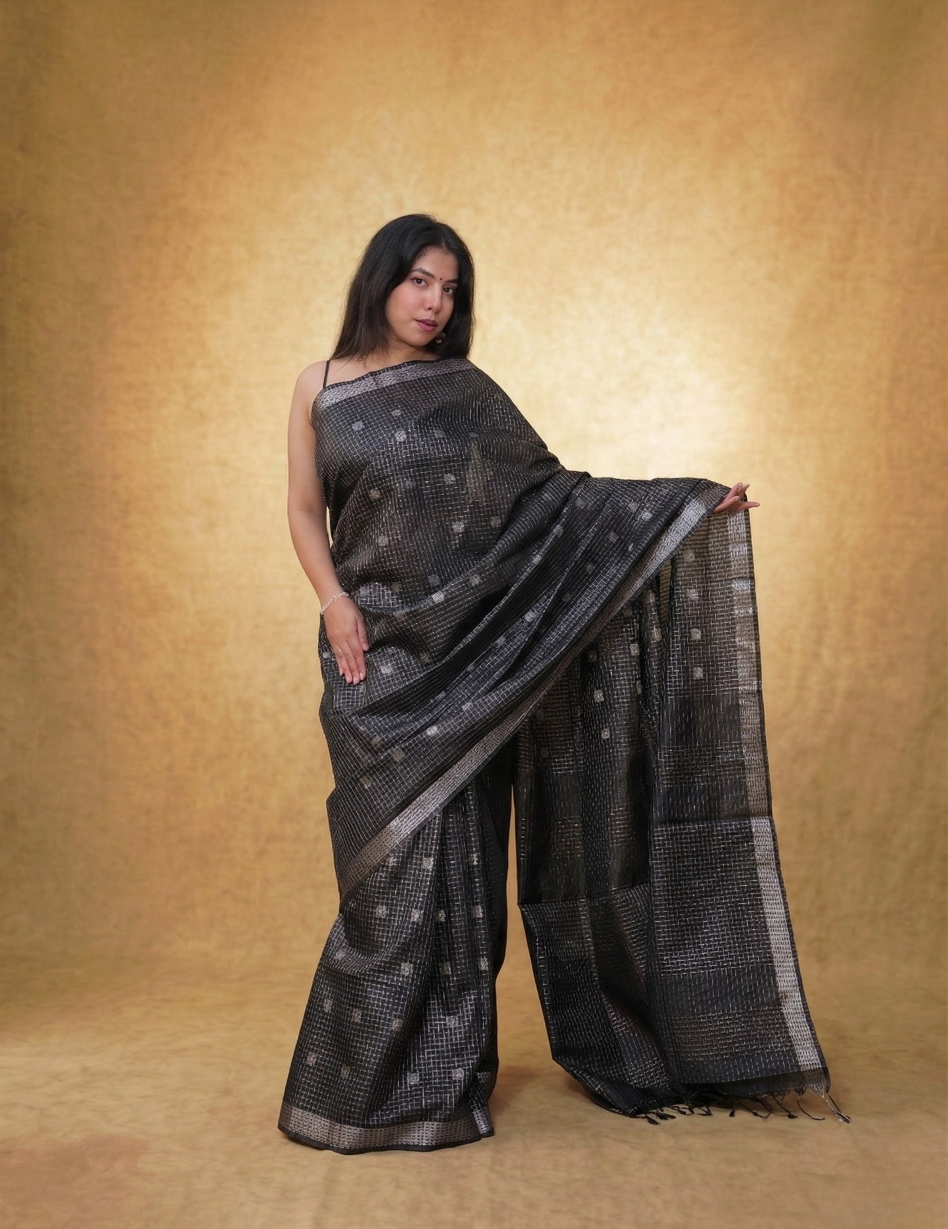 A deep charcoal-black saree with fine woven checks and delicate motifs, finished with understated metallic borders. Effortlessly modern yet rooted in craft—ideal for evening gatherings, contemporary festive wear, and statement minimalism.