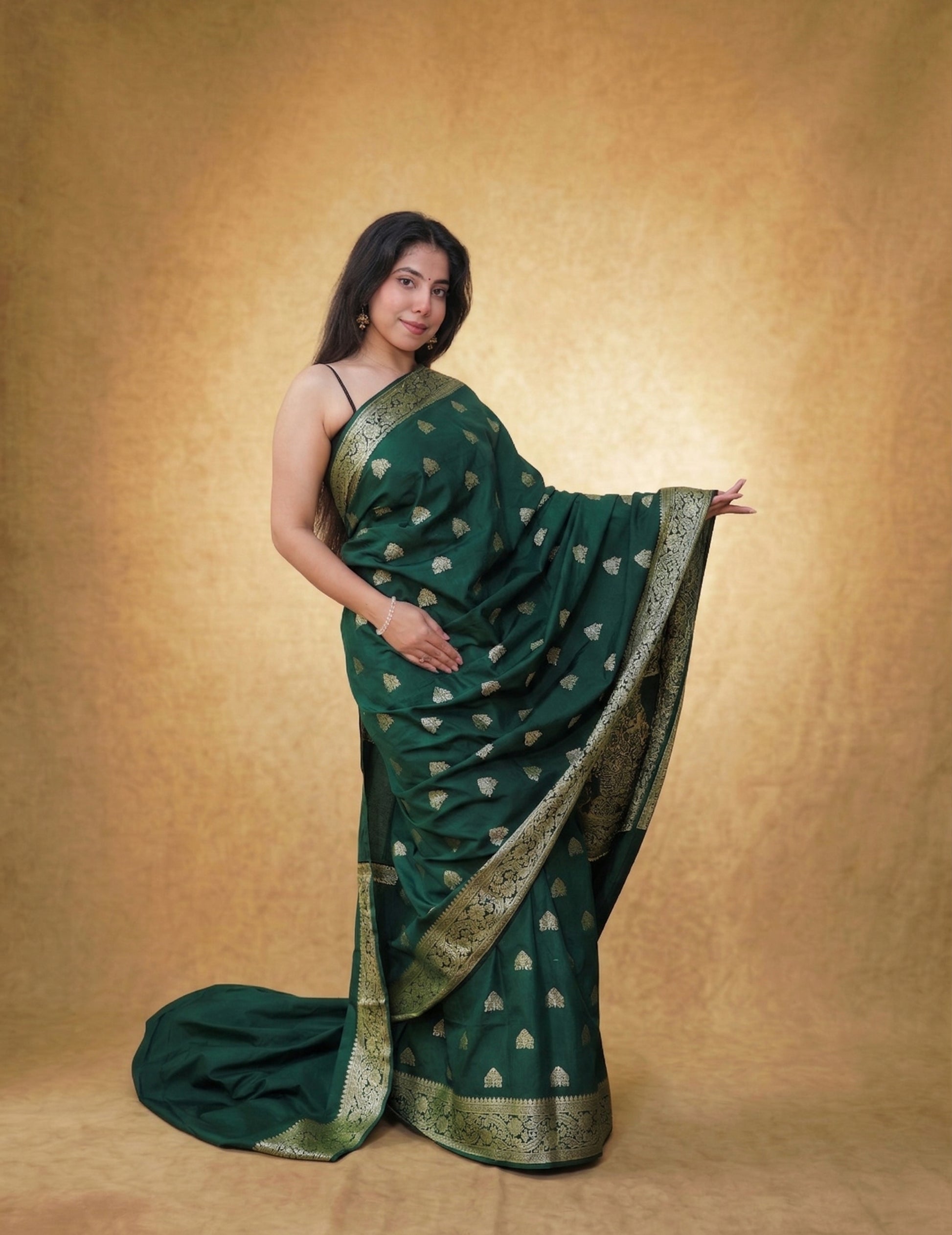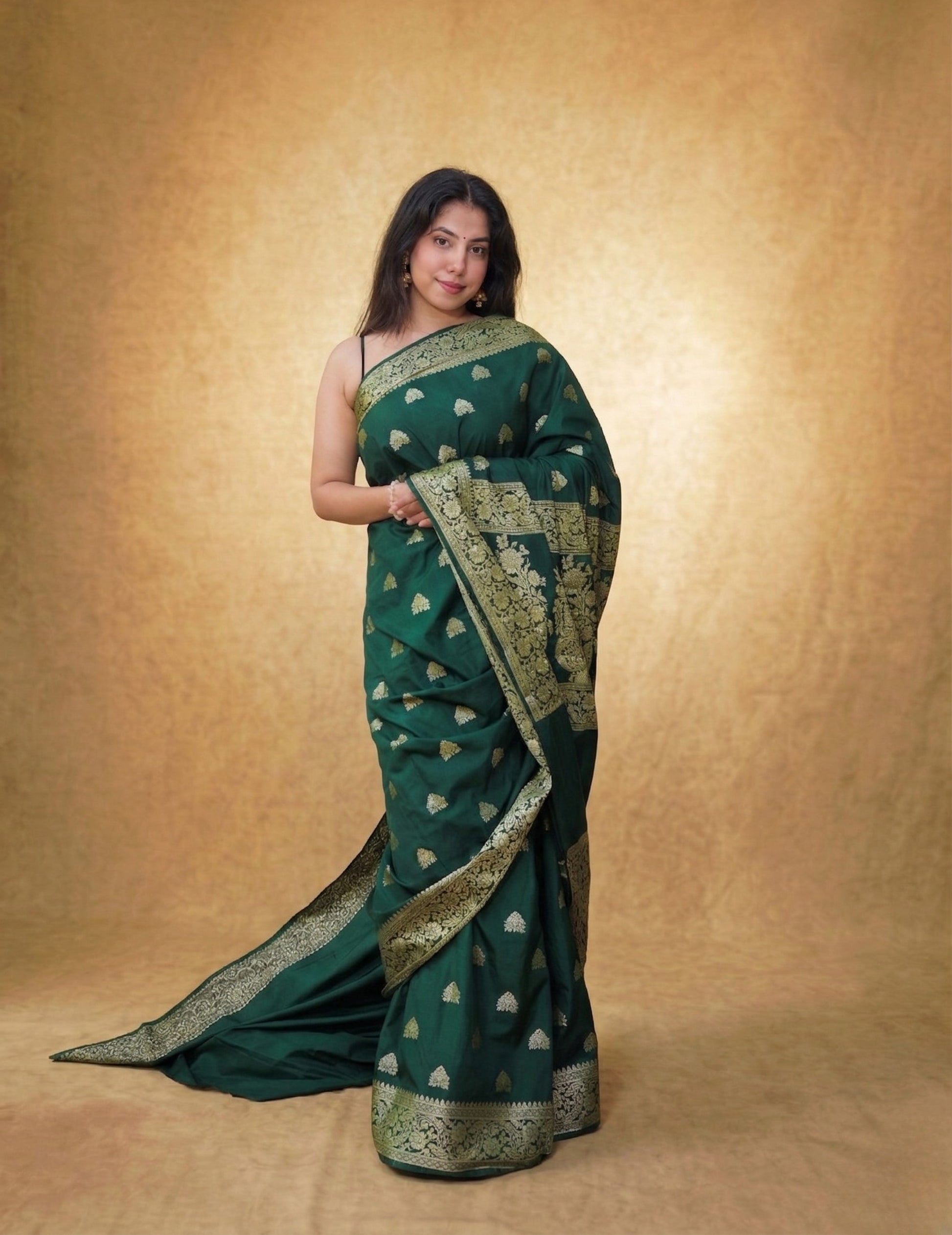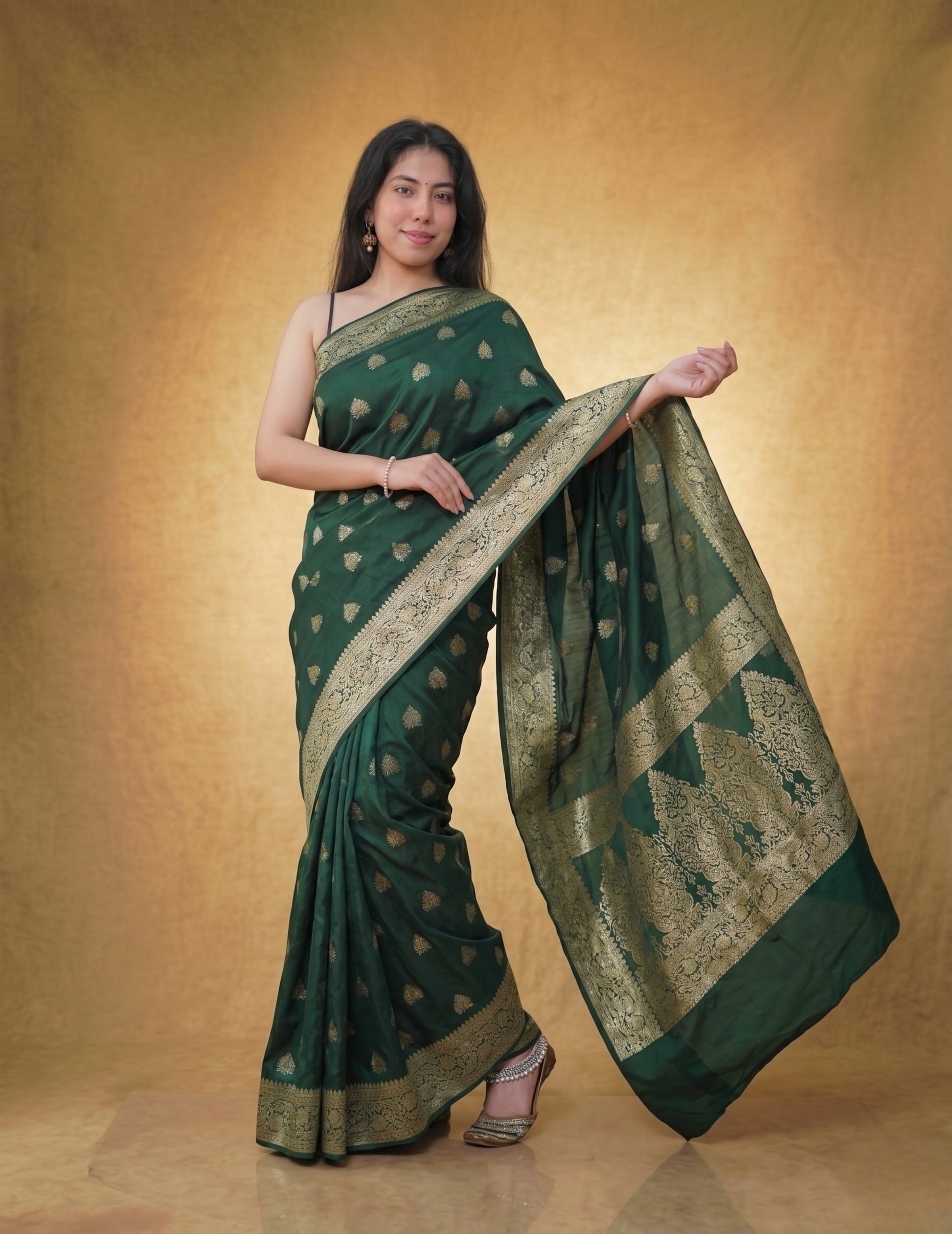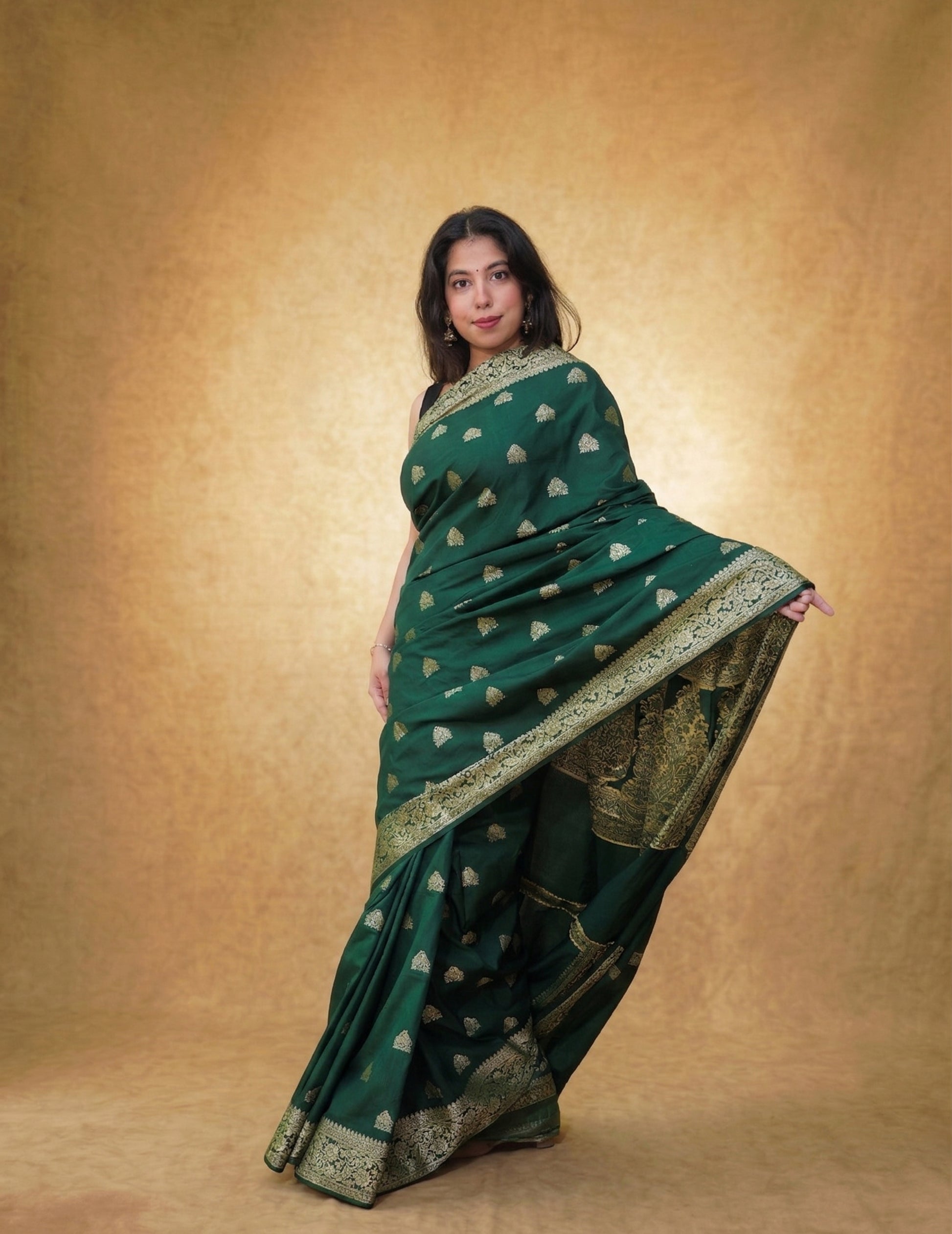 A deep emerald Banarasi saree, sprinkled with delicate gold butis and finished with an intricately woven zari border and pallu. Handwoven in Varanasi, this piece carries an old-world charm—perfect for evening celebrations and festive gatherings.